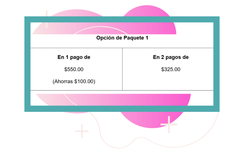 Es importante saber comunicar visualmente los beneficios de cada uno de los paquetes, mientras más claro estén los beneficios mejor, esto te permite poder cobrar un precio más elevado porque el cliente puede percibir mucho VALOR en tus productos.